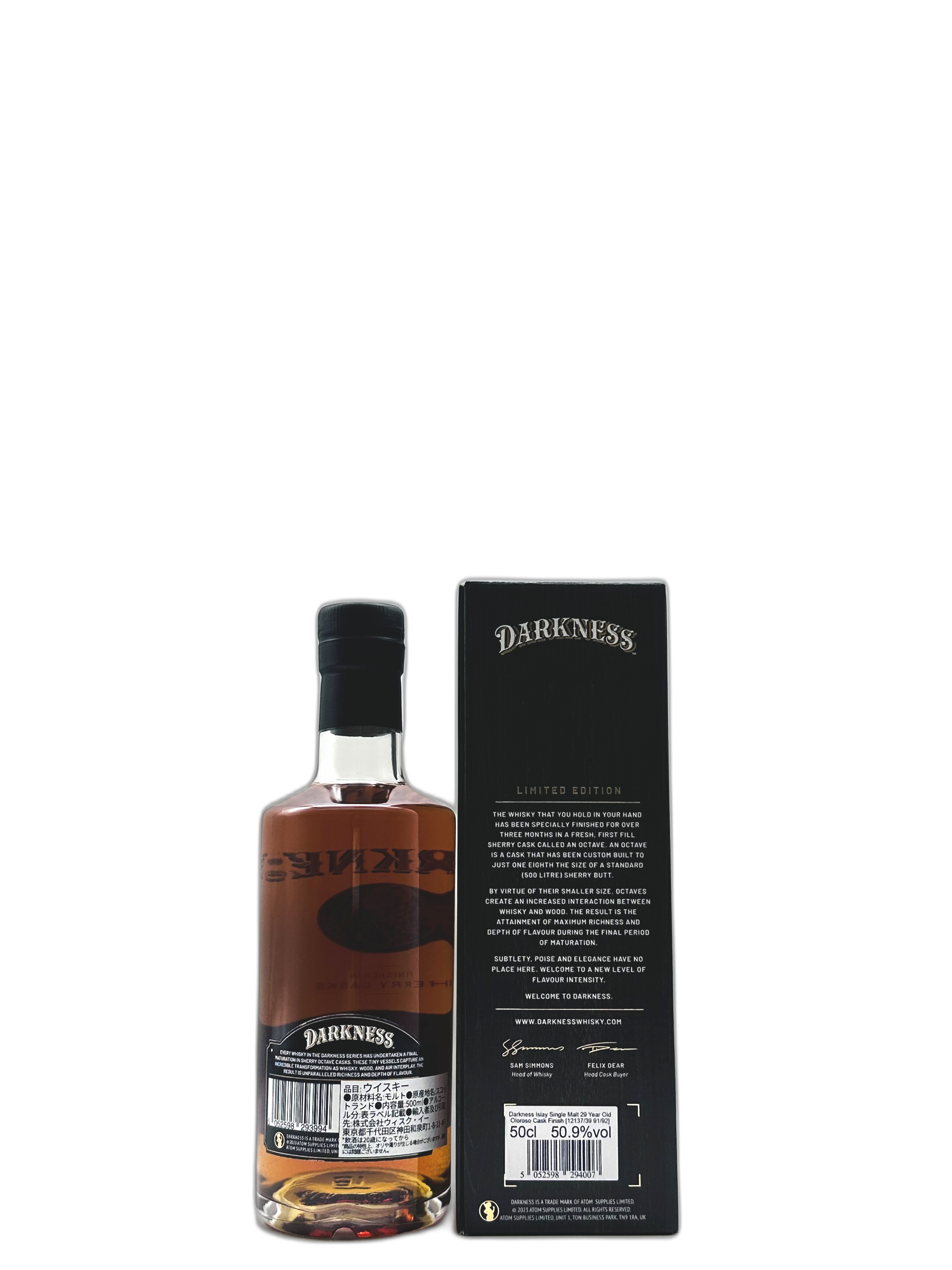 「ダークネス」シリーズはシェリー樽を60Lほどのサイズに組み替えた「オクタブ(小樽)」でフィニッシュしたシリーズで、繊細さ、落ち着き、優雅さとは対照的な「力強さ」、「濃厚さ」、「ボリューム感」がお楽しみいただけます。近年、濃厚なシェリーフレーバーが楽しめるモルトが手に入りづらくなっておりますので、「ダークネス」シリーズでシェリー樽熟成モルトの味わいをぜひお楽しみください。